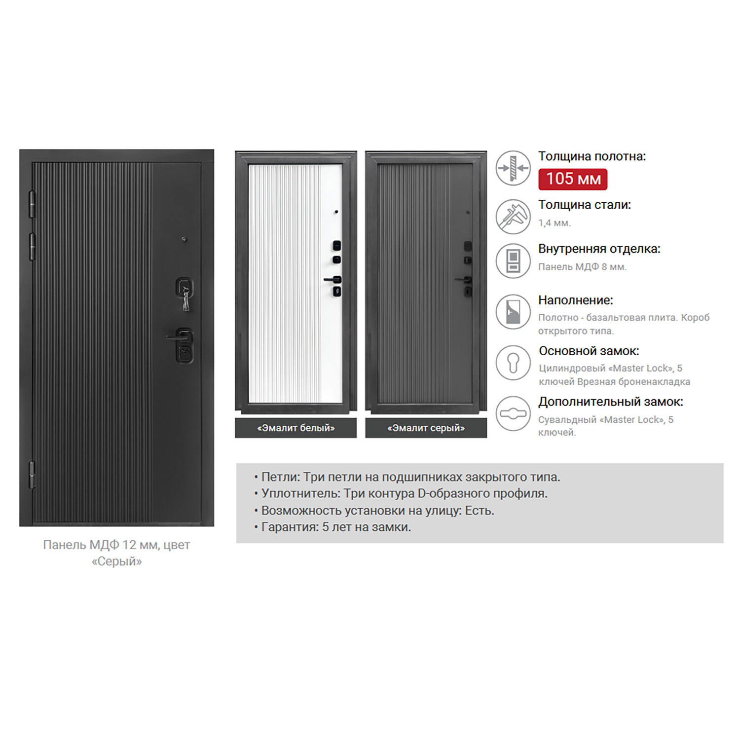 Дверное полотно, дверная коробка, замок основной, замок дополнительный, петли - 3 шт., ручки, наклад