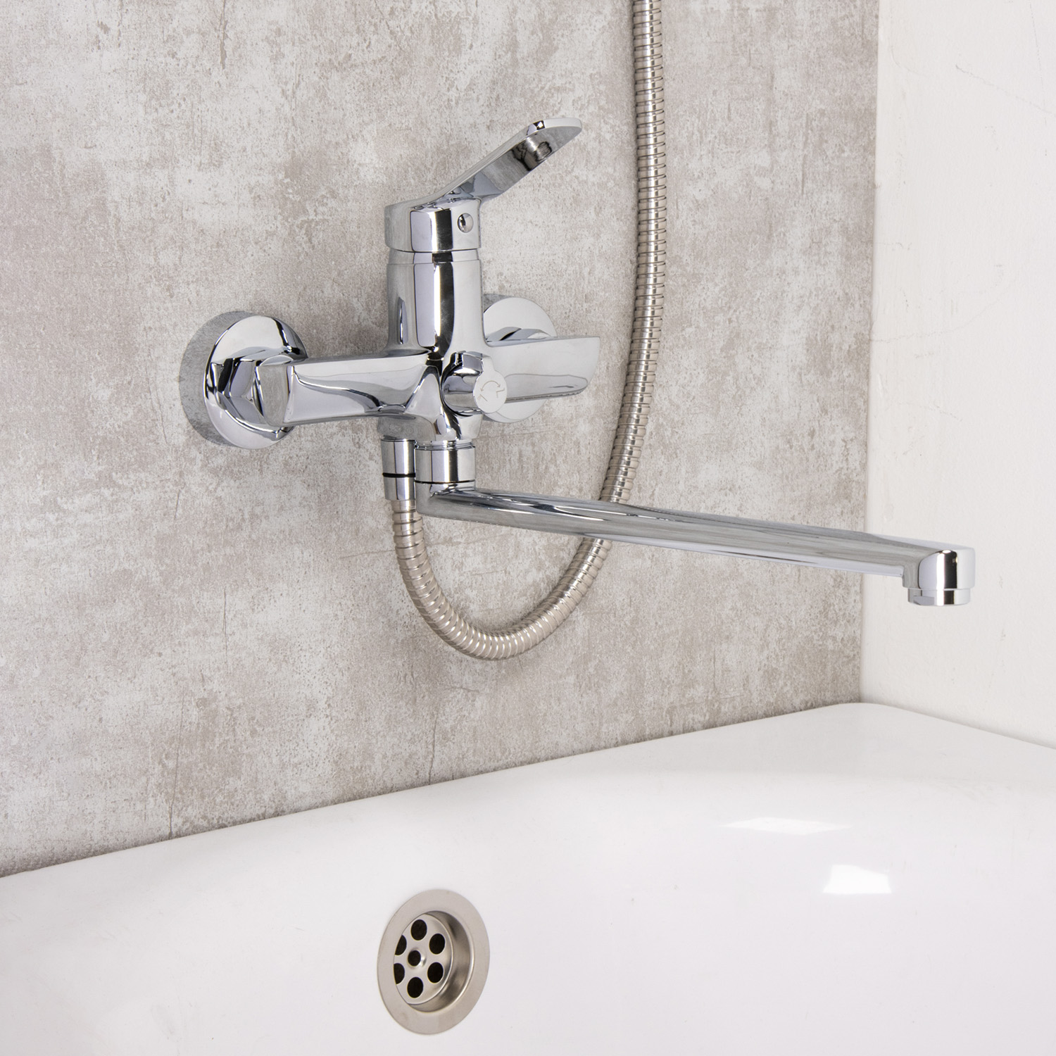 Смеситель, прокладки с фильтром - 2 шт., отражатели - 2 шт., эксцентрики - 2 шт., лейка душевая, шланг, держатель лейки с креплением, инструкция