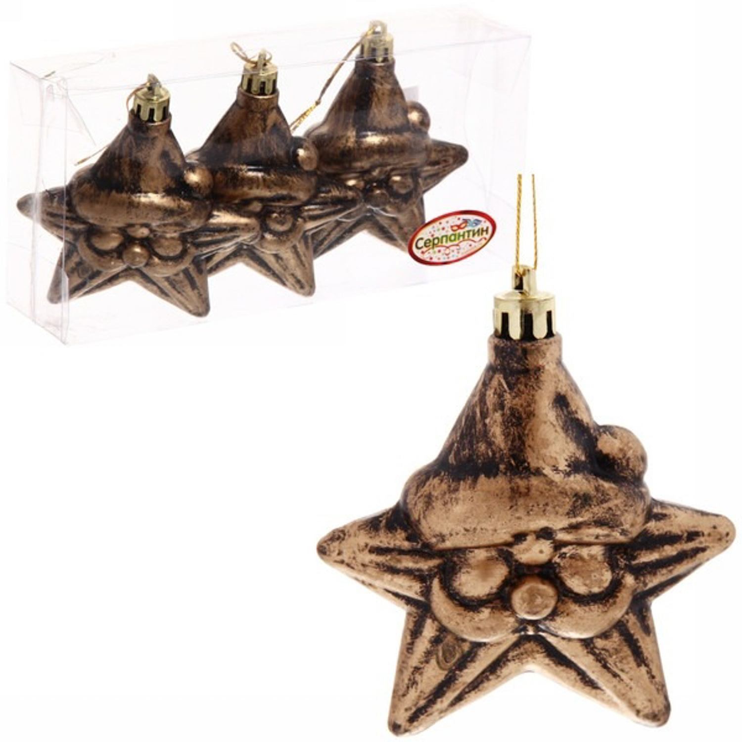 Ёлочная игрушка, набор 3шт, 8см "Звездочка Дед Мороз", бронза