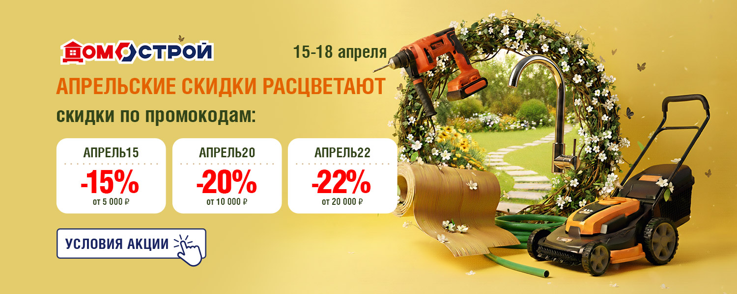 Скидка распространяется только на товары с белыми ценниками и с шильдиком «АПРЕЛЬ», не распространяется на товары с желтыми ценниками, на гр. Строительные материалы. Не суммируется с другими акциями (в том числе со скидкой по дисконтной карте, скидкой для пенсионеров и акцией для новоселов). При применении промокода списание бонусов станет недоступным. Подробности акции можно узнать у продавцов-консультантов, операторов интернет-магазина или по телефону горячей линии. Оплатить покупку акционных товаров бонусами в дни акции нельзя, но бонусы за покупки будут начисляться. Акция действует только для физических лиц.