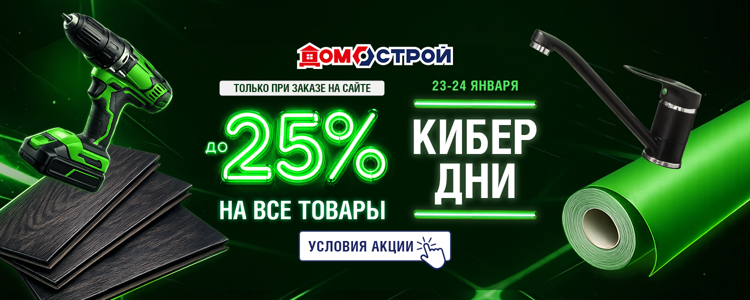 КИБЕРдни в сети ДомоСтрой! Только 2 дня — 23 и 24 января при заказе на сайте скидка до -25% на огромный ассортимент товаров. Это отличная возможность приобрести напольные покрытия, обои, люстры, инструменты, двери, товары для дома и многое другое по привлекательным ценам! Оформляйте заказы в дни акции со скидкой и забирайте в течение 3 дней после.
