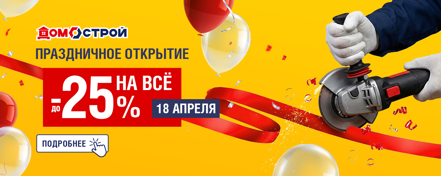 Празднуем открытие нового магазина ДомоСтрой в Чебаркуле 18 апреля по адресу ул. Октябрьская, д. 20! И в честь этого праздника дарим скидку до -25%.