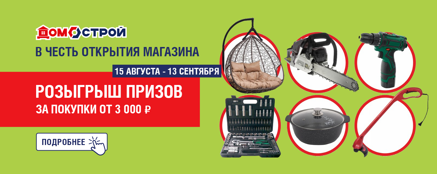 Розыгрыш стартует 13 сентября в 14.00 на праздничном открытии магазина ДомоСтрой по адресу: ул. Челюскинцев, 68А.